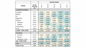 Samples in liquids-focused basins increased 0.2% to 18.5 Bcf/d. The Permian sample declined 2.6% to 6.0 Bcf/d, while the Bakken sample gained 6.1% W-o-W.