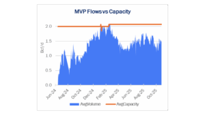 Downstream constraints on Transco limit how much gas can currently flow on MVP, but Transco’s Southeast Supply Enhancement is expected to add 1.6 Bcf/d of additional capacity once it enters service in late 2027, alleviating those constraints.