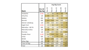 The US rig count increased by 1 for the week of Nov. 29 to 520 rigs. The Eagle Ford (-3), Anadarko (-1) and Powder River (-1) basins lost rigs while the ArkLaTex (+1), DJ (+1), Marcellus+Utica (+1) and Permian (+1) gained rigs W-o-W.
