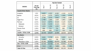 Samples in liquids-focused basins decreased 1.0% to 19.0 Bcf/d. The Permian sample declined 2.4% to 6.4 Bcf/d, while the Eagle Ford sample gained 4.5% W-o-W.