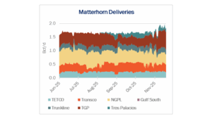 Matterhorn was originally constructed with 2.0 Bcf/d of capacity. The WhiteWater joint venture had expected to bring the additional compression online sometime after the pipeline’s initial ramp, but the timing of that expansion was pushed to 4Q25. The project is critical to opening more egress for Permian Basin gas production and providing some relief for low Waha hub prices.